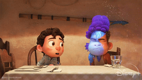 Luca Paguro reacts with surprise as Alberto Scorfano transforms into his sea monster form at a dinner table.