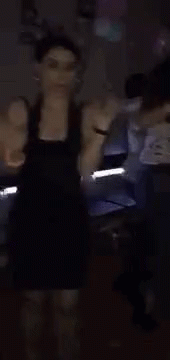 Yari dancing energetically in a black dress in a dimly lit room, possibly at a party.