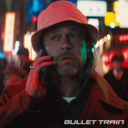 Brad Pitt as Ladybug in Bullet Train, reacting with 'Oh Really?' while on a phone call in a bustling city.