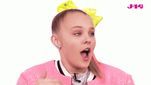 JoJo Siwa reacts with an 'Oh Wow Woah' expression, hands raised, wearing a pink sequined jacket and her signature yellow bow.