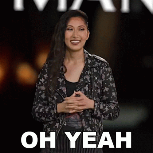 Mariko Takahashi, also known as atomicmari, stands in a floral jacket with 'OH YEAH' text displayed.