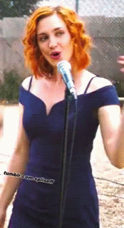 Kat Barrell singing into a microphone, looking excited and performing a happy dance in a blue dress.