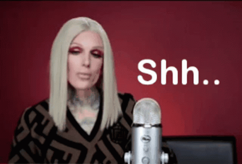 Jeffree Star makes a 'shh' gesture while sitting in front of a microphone, with 'Shh..' text on screen.