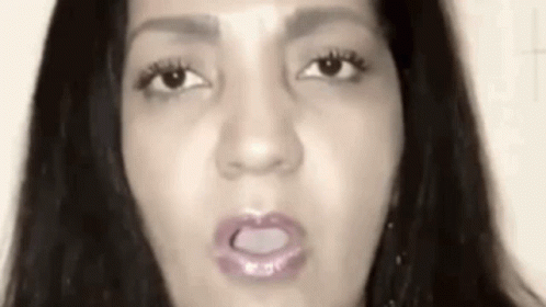 Close-up of a woman's face with her mouth open, showing her tongue slightly. The video has a black and white tone.