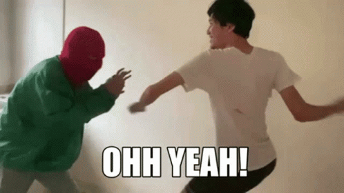 Two men, one in a red mask and green hoodie, the other in a white shirt, engage in an energetic dance-off.
