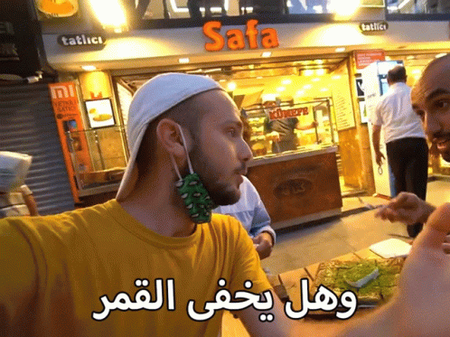 A man in a yellow shirt stands in front of a Safa dessert shop, enjoying a traditional sweet.