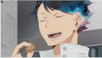 Oi, an anime character with galaxy hair, enjoys a small snack with eyes closed in contentment.