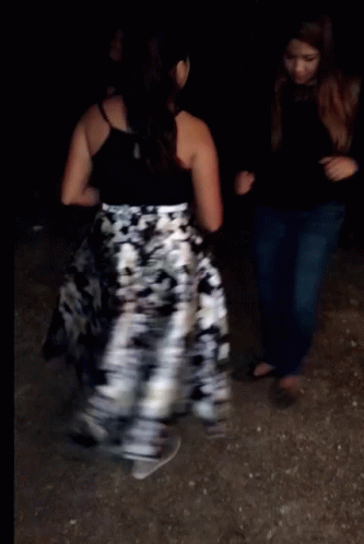 Woman in black tank top and floral skirt dancing to cumbion music at night.