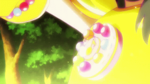 Ojamajo Doremi characters Kawatani Reika, Nagase Sora, and Yoshitsuki Mire transform and laugh with magic brooms.
