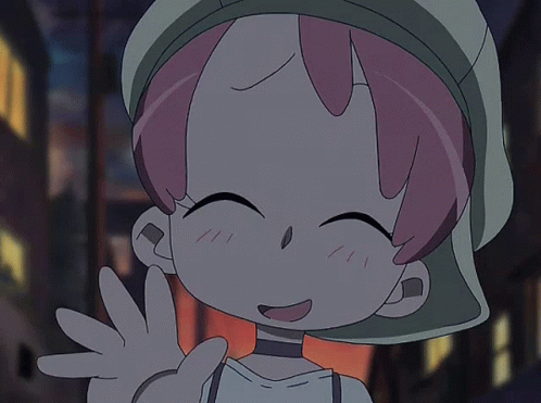 a cartoon character with pink hair is smiling and waving her hand