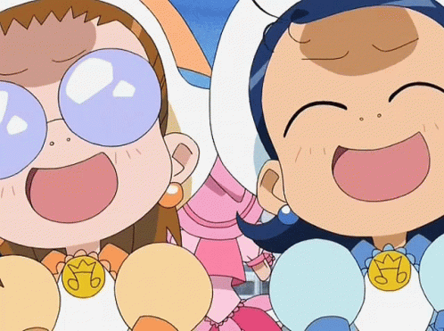 Ojamajo Doremi Naisho characters Fujiwara Hazuki, Harukaze Doremi, and Senoo Aiko laughing.