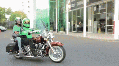A man in a green helmet drives an Ojek Moge motorcycle with a woman passenger on a city street.
