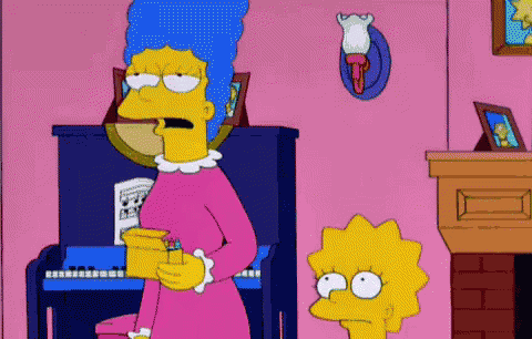 Marge Simpson holds a box while Lisa Simpson looks on, standing near a piano in their living room.