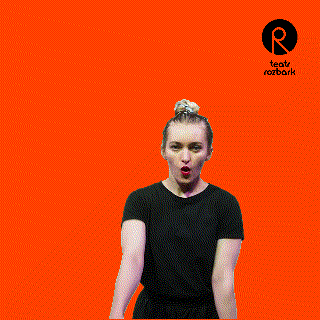 A woman in a black shirt makes an 'ok' gesture in front of an orange background with the Teatr Rozbark logo.
