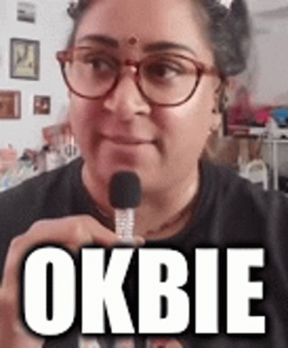Pinky Patel, wearing glasses and a bindi, holds a microphone with 'Ok Bie' text, delivering a humorous moment.