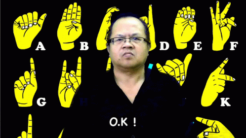 A man wearing glasses demonstrates the 'OK' sign in sign language, with a background showing the manual alphabet.