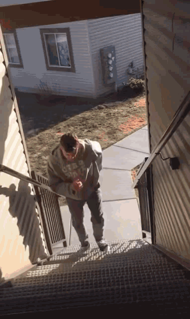 A man walking up a metal staircase realizes his shoelace is untied and proceeds to tie it.