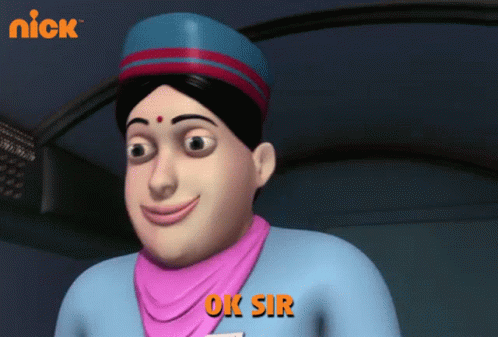 An animated air hostess from Motu Patlu says 'Ok Sir' and nods in affirmation, confirming a request.