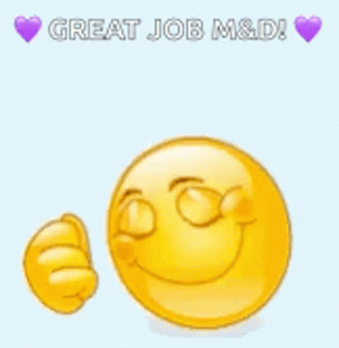 A cheerful emoji gives an enthusiastic thumbs up, celebrating 'GREAT JOB M&D!' with a big smile.
