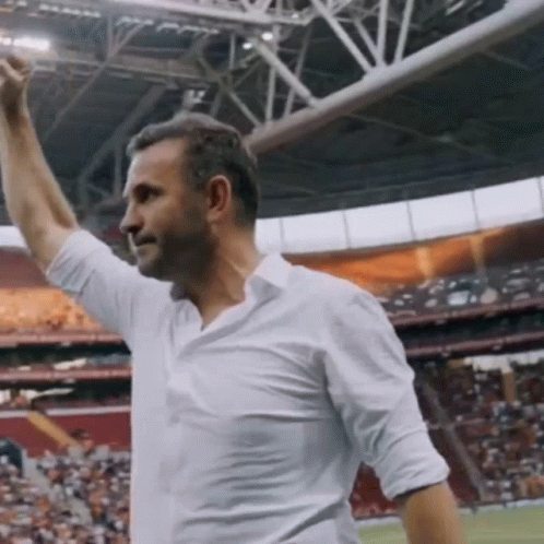 Okan Buruk, coach of Galatasaray, applauds the fans in a stadium, showing appreciation.