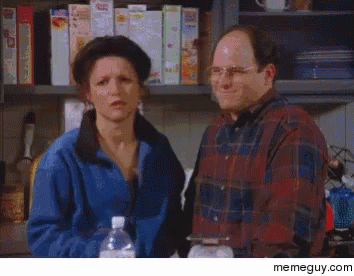 Elaine and George from Seinfeld react with 'Okay Alright' in a kitchen setting.
