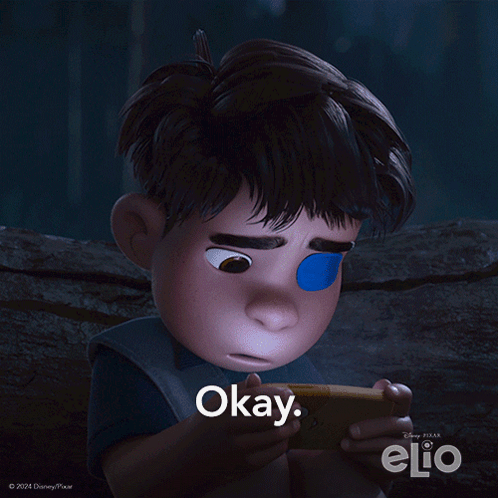 Elio Solis, the animated boy from Disney Pixar's Elio, looks at his phone and says 'Okay, Bye, I love you.'