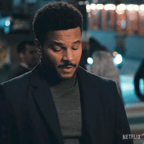 Cj Graham, dressed in a suit, shrugs and says 'Okay' in a Netflix scene.