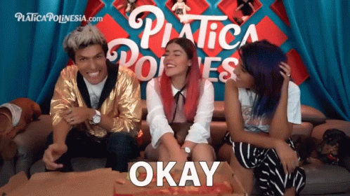 Los Polinesios react with an enthusiastic 'Okay' while sitting on a couch, enjoying a fun moment.