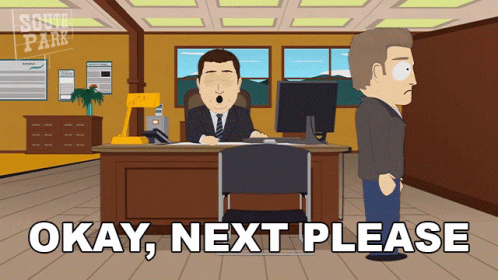 A South Park character at a desk says 'Okay, Next Please' to a waiting customer in a customer service setting.