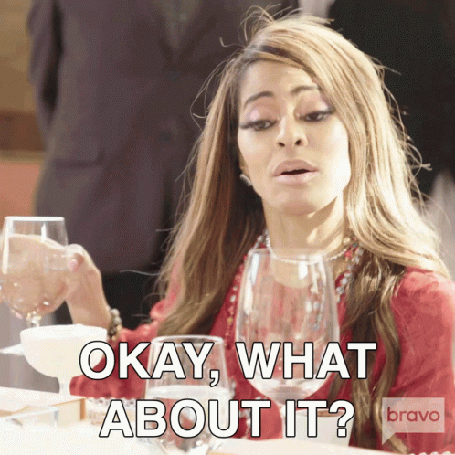 Mary Cosby delivers the iconic line 'Okay, What About It?' from Real Housewives of Salt Lake City, with a dismissive look.