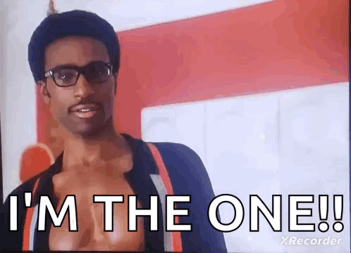Davis Ruffin, a man in glasses, stands before a red wall, declaring 'I'M THE ONE!!' with an 'Okay Whatever' attitude.