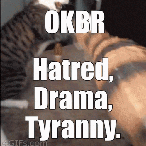 A cat and a Trex toy in a dramatic confrontation, overlaid with text 'OKBR Hatred, Drama, Tyranny.'