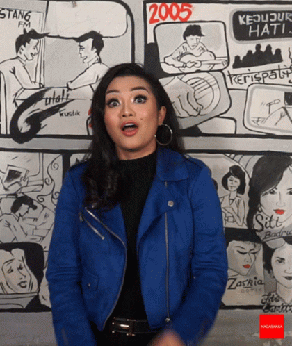 Fitri Carlina in a blue jacket, smiling and making 'OK' gestures in front of a wall with music-themed drawings.