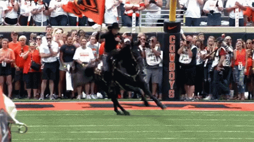 Oklahoma State's mascot, Bullet, gallops onto the football field on a black horse, waving a flag to cheering fans.