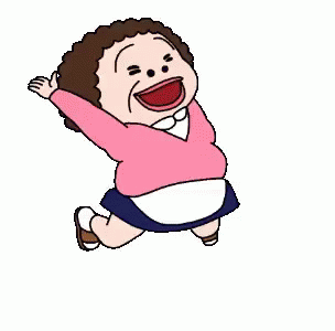 A cheerful cartoon old lady with curly hair, wearing a pink sweater and blue skirt, squats and laughs heartily.