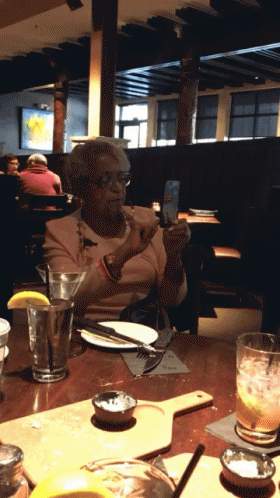 An older woman is seated at a restaurant table, holding up her phone, possibly taking a selfie.
