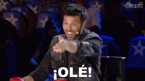 Dani Martinez, judge on Got Talent España, excitedly cheers 'Olé!' with a raised arm and big smile.