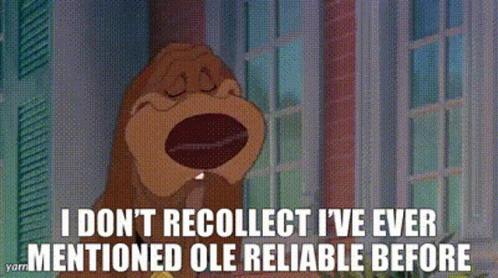 A cartoon dog from All Dogs Go to Heaven says 'I don't recollect I've ever mentioned Ole Reliable before'.