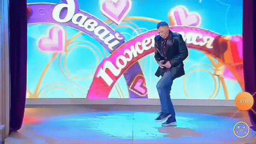 Oleg Mongol energetically dancing on a brightly lit stage with 'Let's Get Married' show title in background.