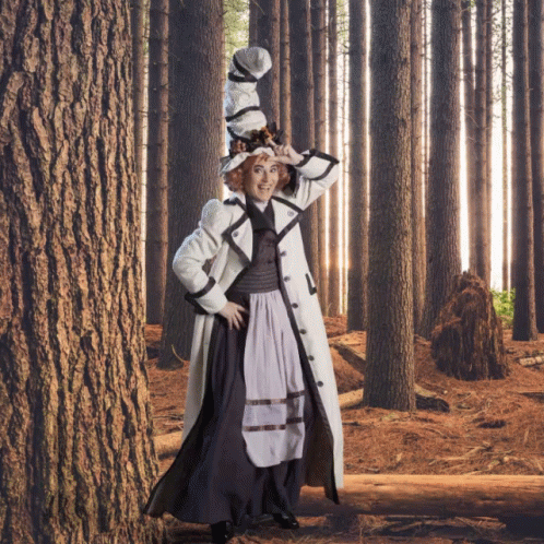 A whimsical character, possibly Olentzero or Mari Domingi, in a unique hat and coat, posing playfully in a sun-dappled forest.