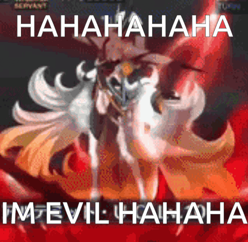 Olga Marie Animusphere from Fate/Grand Order laughs maniacally, declaring 'I'm evil hahaha' in a red-themed scene.