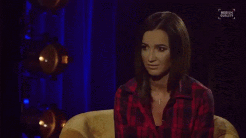 Olga Buzova expressing surprise and indignation while sitting in a plaid shirt on a yellow couch.