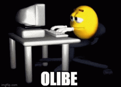 A yellow emoji-like character, often associated with 'Goldfish Memory', typing 'OLIBE' on a computer keyboard.