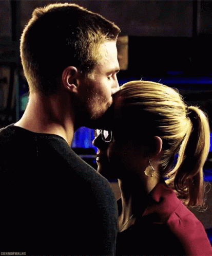 Oliver Queen shares a tender forehead kiss with Felicity Smoak, a moment of affection between the Olicity couple.