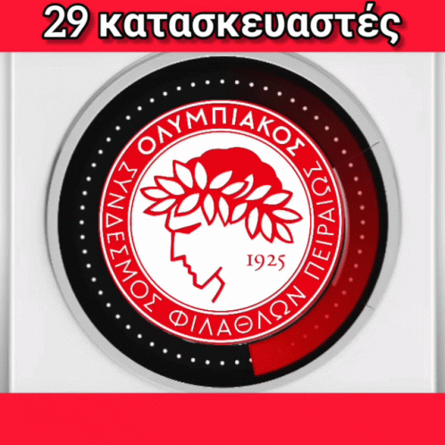 Olympiacos logo spins like a washing machine, with text about 29 manufacturers and 'mourning'.