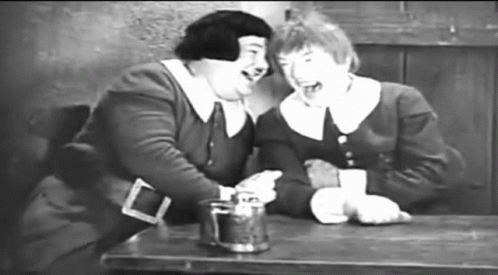 Oliver Hardy and Stan Laurel share a hearty laugh while sitting at a table with a metal mug in this classic black and white scene.