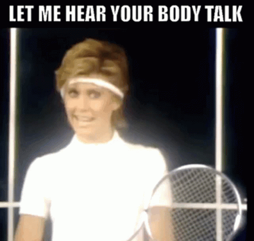 Olivia Newton-John in a classic 80s tennis outfit, ready to talk body language and get physical.
