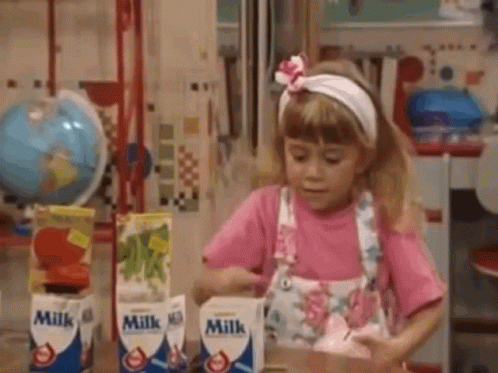 A young Olsen twin playfully interacts with milk cartons in a kitchen setting, possibly related to 'Olsen Money'.