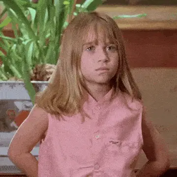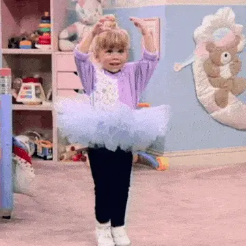 Mary-Kate or Ashley Olsen, from Full House, smiles with pigtails and red scrunchies.