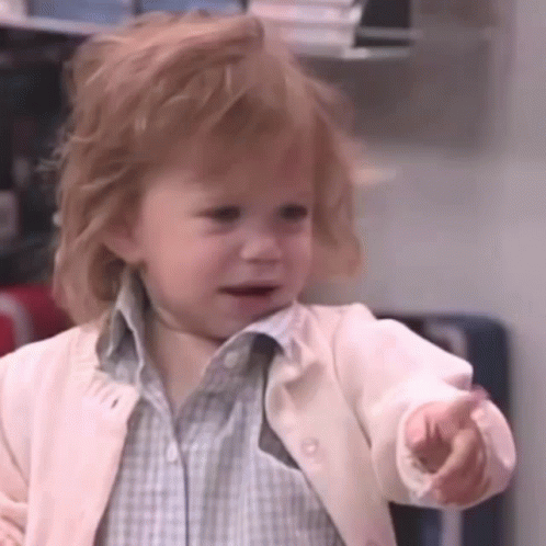 Young Mary-Kate or Ashley Olsen, one of the famous Olsen twins, appears upset and points, wearing a plaid shirt and cardigan.